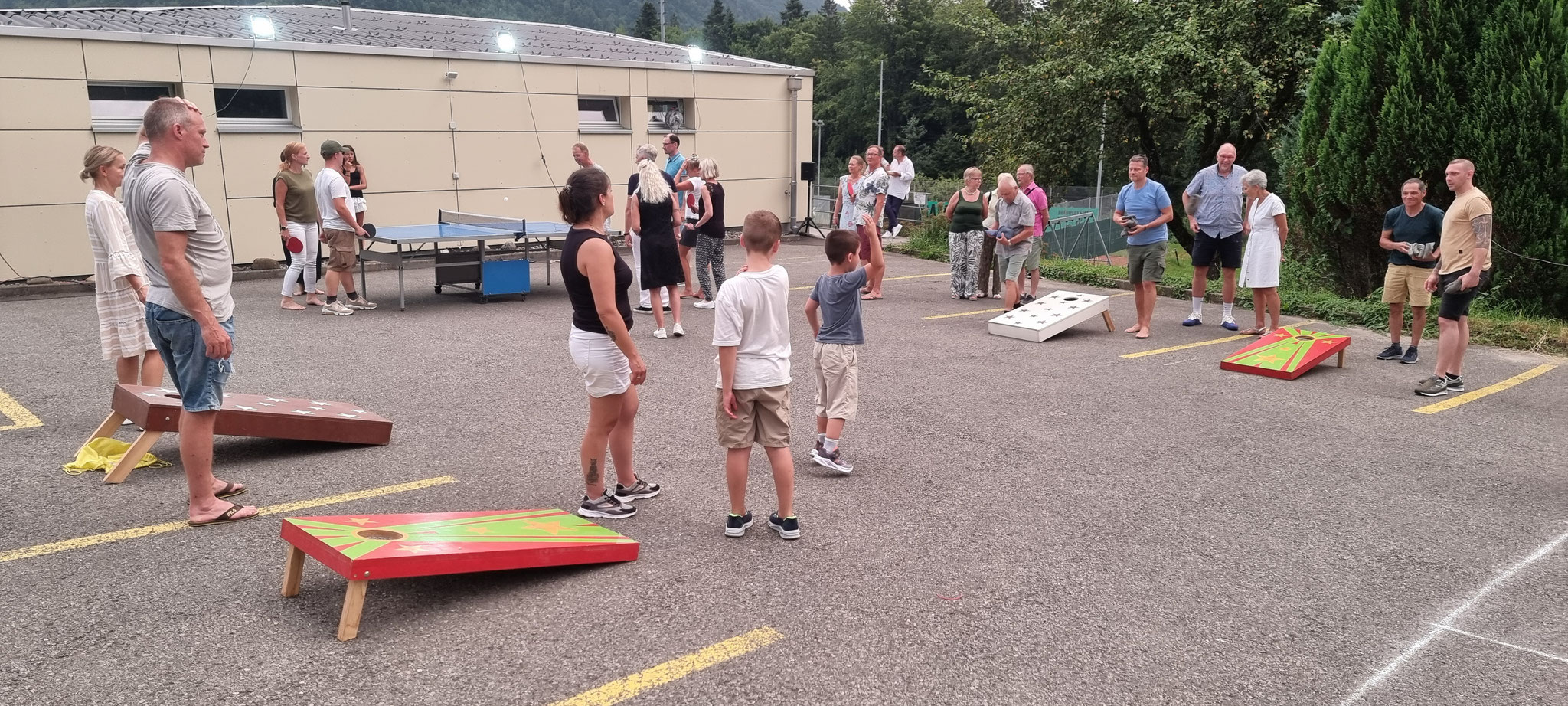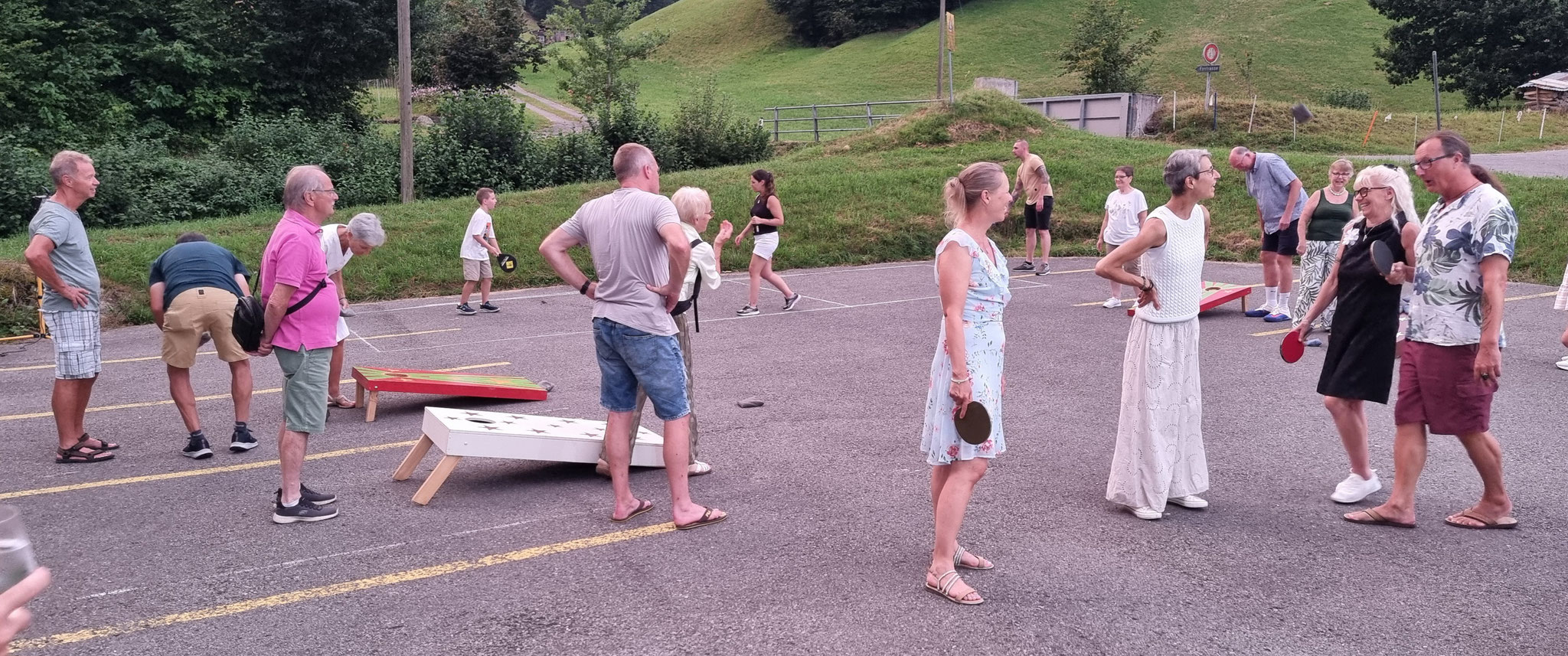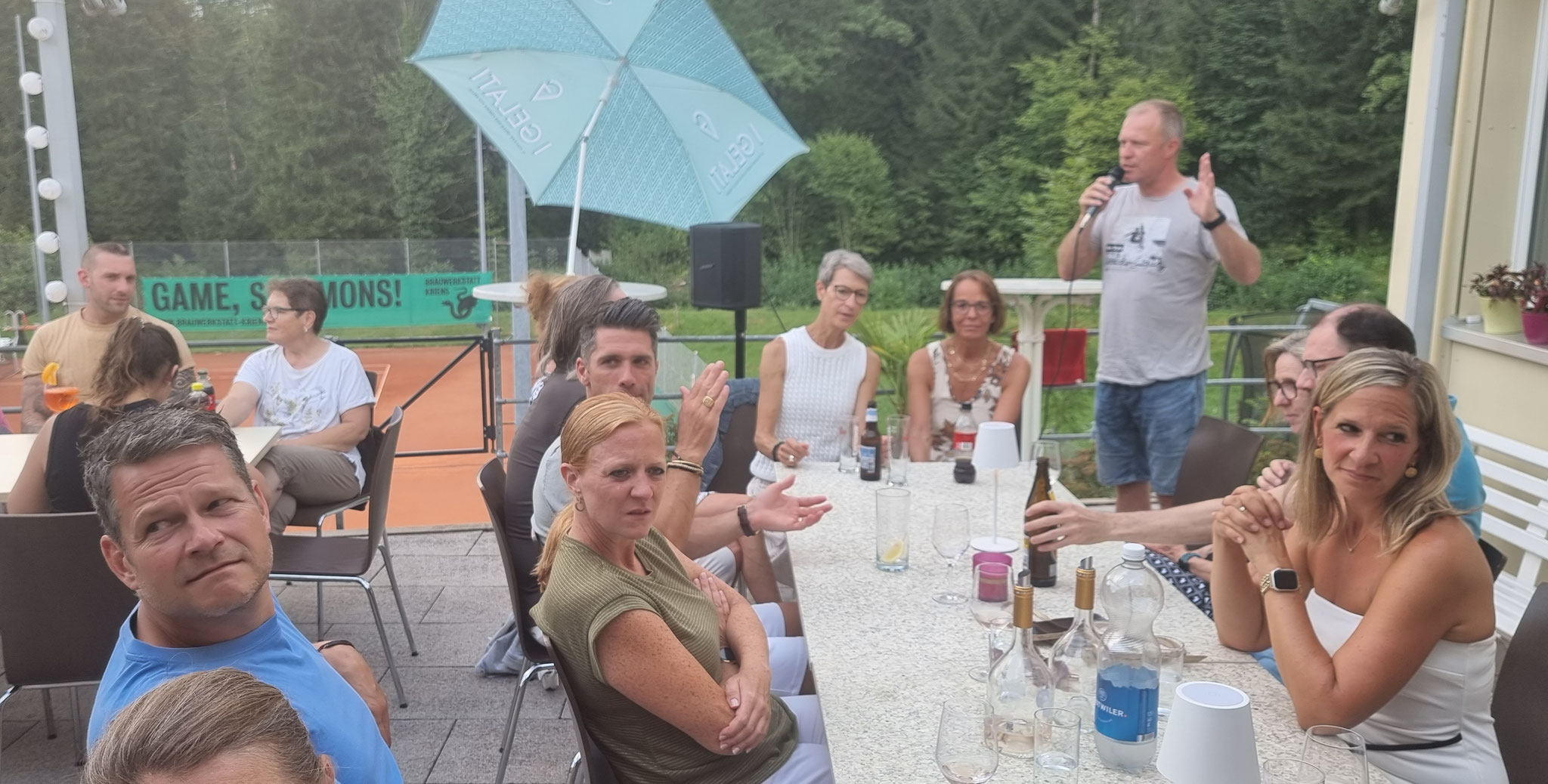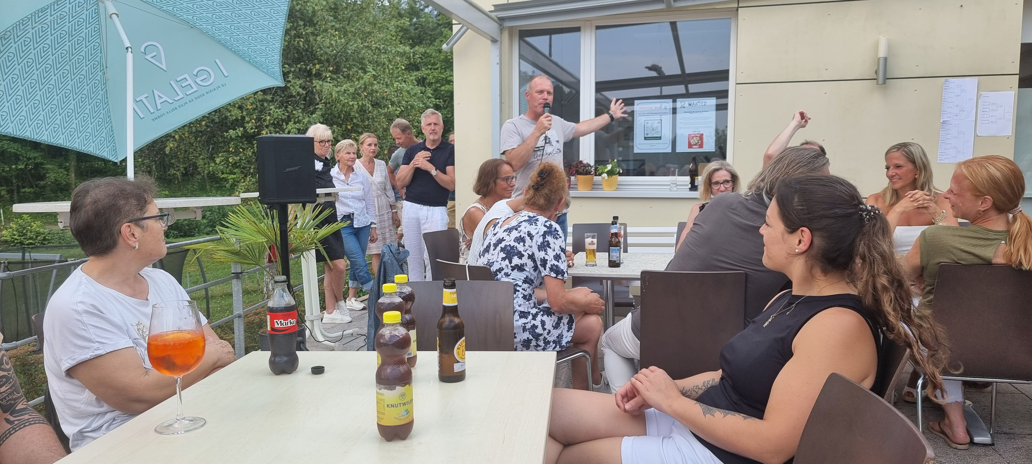 Die 58 sich des Sommerfest-Freuenden konnten auf der Terrasse ihren Apéro geniessen, die Mixed-Partien beurteilen und den schwitzend Kämpfenden applaudieren.